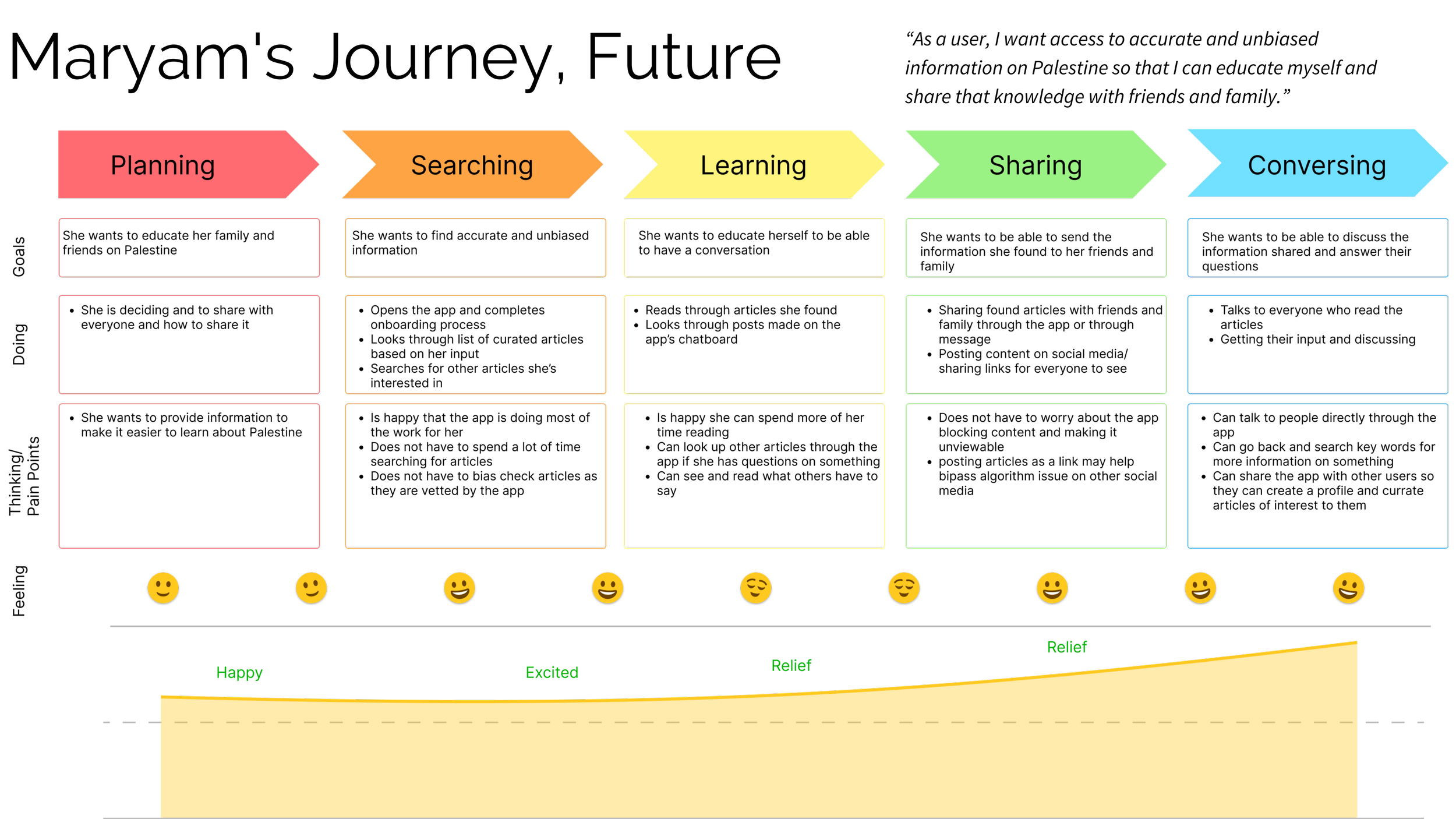 Next, I took Maryam, the activist persona, and created a journey map highlighting her current journey to find accurate and unbiased information on Palestine. I then created a future journey map highlighting how Falastini would resolve the hardships Maryam currently faces and how much easier her process to find information becomes.